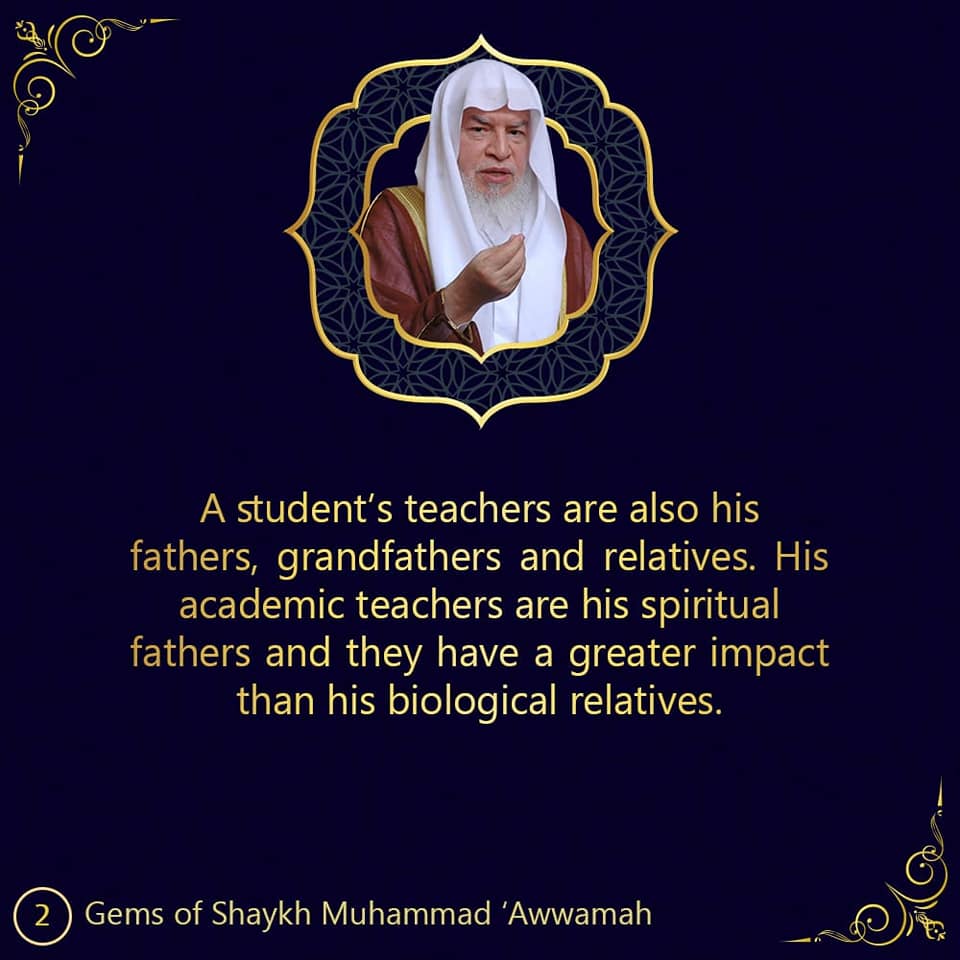 A studentaposs teachers are also his fathers, grandfathers and relatives. His academic teachers are his spiritual fathers and they have a greater impact than his biological relatives.Shaykh Muhammad Awwamah