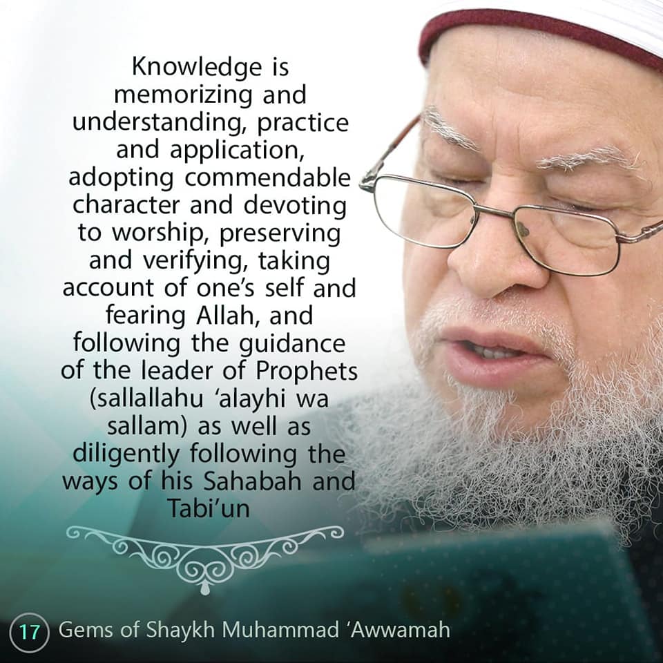 Knowledge is memorizing and understanding, practice and application, adopting commendable character and devoting to worship, preserving and verifying, taking account of oneaposs self and fearing Allah, and folloving guidence of the leader of Prophets sallallahu alayhi wa sallam as well as diligently folloving the ways of his Sahabah and Tabiaposun.