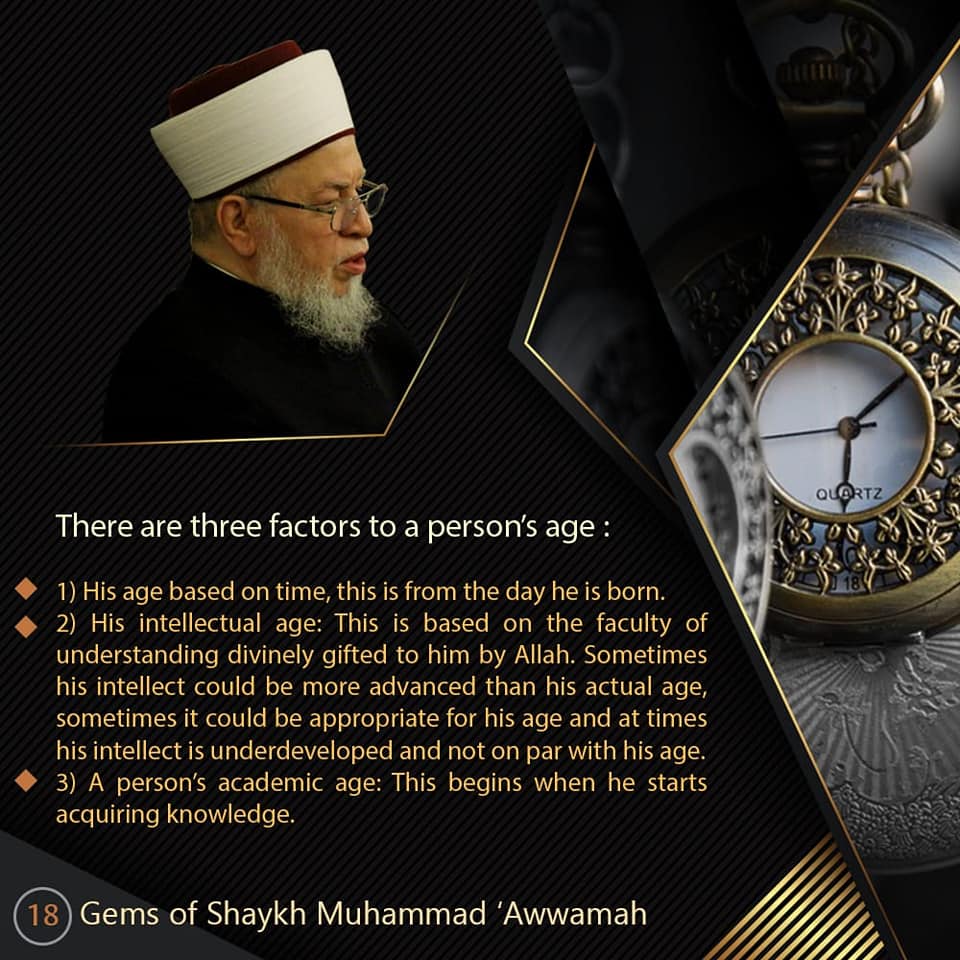 There are three factors to a personaposs age1 His age based on time, this is from the day he is born.2 His intellectual age This is based on the faculty of understanding divinely gifted to him by Allah. Sometimes his intellect could be more advanced than his actual age, sometimes it could be more...