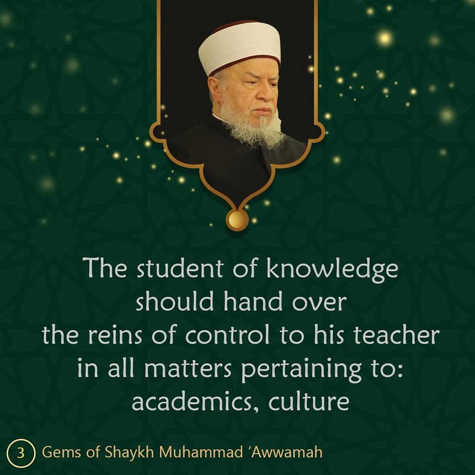 The student of knowledge should hand over the reins of control to his teacher in all matters pertaining to academics, culture.Shaykh Muhammad Awwamah