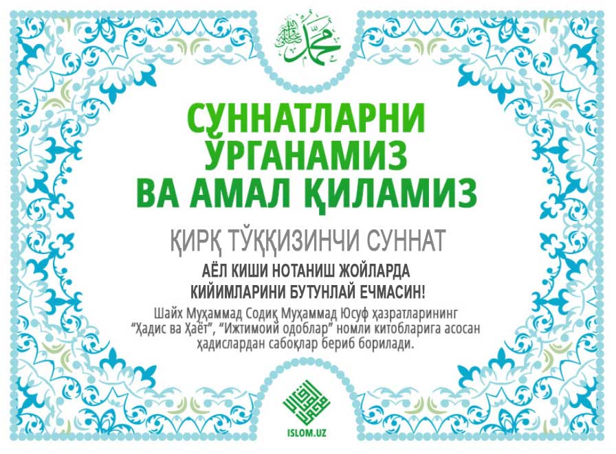 «Расулуллоҳ соллаллоҳу алайҳи васаллам: «Мўмин бўлмагунингизча жаннатга кирмайсиз. Ўзаро муҳаббат қўймагунингизча мўмин бўлмайсиз. Ўзаро муҳаббат қўйишингизга сабаб бўладиган нарсага далолат қилайми? Ораларингизда саломни кенг ёйинг», дедилар».
