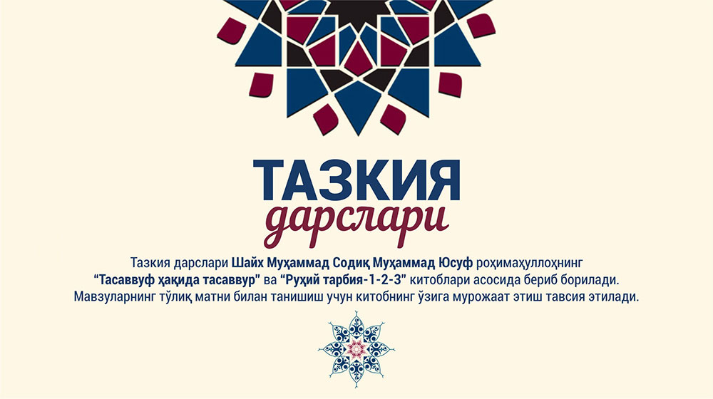 Тазкия дарслари Шайх Муҳаммад Содиқ Муҳаммад Юсуф роҳимаҳуллоҳнинг Тасаввуф ҳақида тасаввурrdquo ва Руҳий тарбия123rdquo китоблари асосида бериб борилади. давоми...