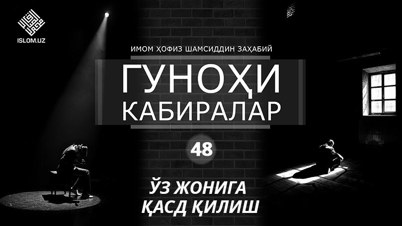 Расулуллоҳ соллаллоҳу алайҳи васаллам айтдилар: «Кимки тоғдан ўзини ташлаб, жонига қасд қилса, у жаҳаннам оловида абадул-абад ўзини пастга ташлайди. Кимки заҳар ичиб жонига қасд қилса, у қўлида заҳарини тутиб, жаҳаннам оловида абадул-абад ўзини заҳарлайди. Кимки ўзини темир билан ўлдирса, у қўлида темирини тутиб, жаҳаннам оловида абадул-абад у билан ўзини уради» (Бухорий, Муслим ва бошқалар ривояти).