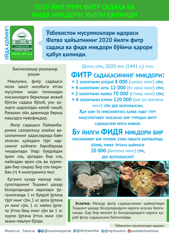 Шунга кўра, 2020 йил (1441 ҳ.) учун ФИТР садақасининг миқдори: