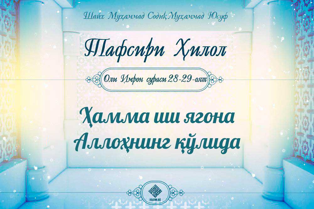 «Мўминлар мўминларни қўйиб, кофирларни ўзларига дўст тутмасинлар. Ким буни қилса, бас, у Аллоҳ(дўстлиги)дан ҳеч нарсада йўқдир. Магар улардан қўрқиб, сақлансангиз, майли. Аллоҳ сизларни Ўзидан огоҳлантирур. Ва сўнгги қайтиш фақат Аллоҳгадир». (Оли Имрон сураси, 28-оят)