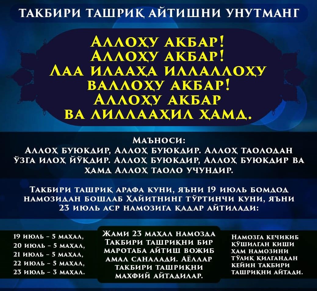 Такбири ташриқ арафа куни, яъни 19 июль бомдод намозидан бошлаб Ҳайитнинг тўртинчи куни, яъни 23 июль аср намозига қадар айтилади: