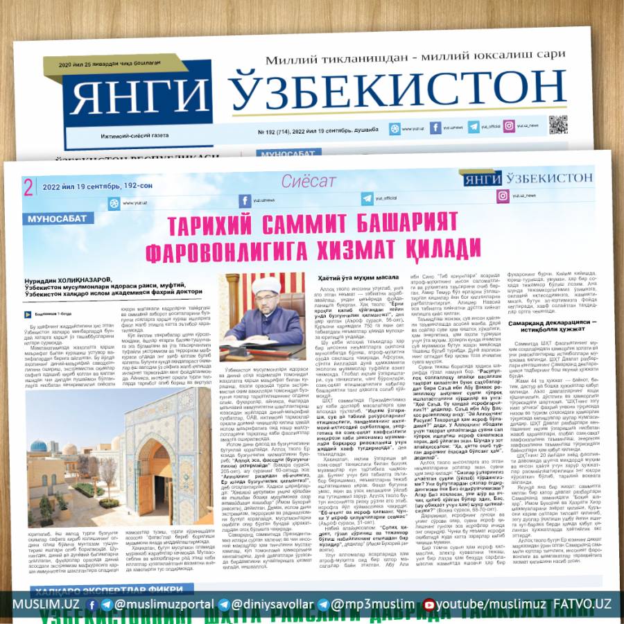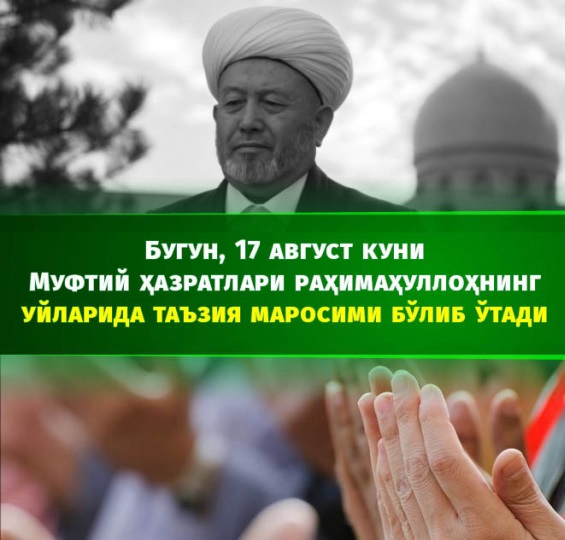 Бугун, 17 август куни Ўзбекистон мусулмонлари идораси раиси, муфтий Усмонхон Темирхон ўғли Алимов раҳимаҳуллоҳининг Тошкент вилояти Қибрай туманида жойлашган ўз хонадонларида таъзия маросими бўлиб ўтади.