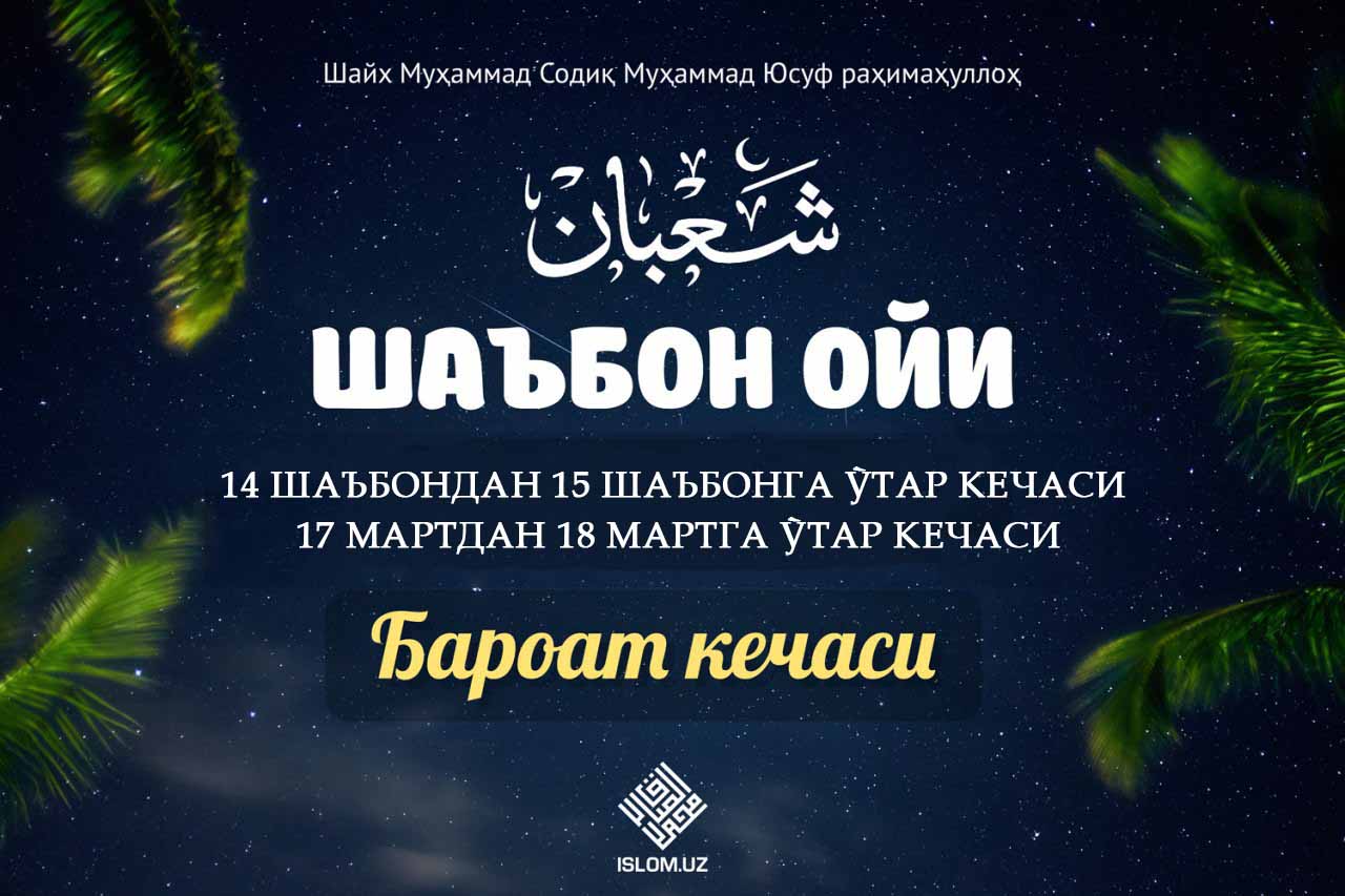 «Қачон Шаъбон ярими кечаси бўлса, унинг кечасини бедор ўтказинглар, кундузининг рўзасини тутинглар. Чунки ўшанда Аллоҳ қуёш ботиши пайтида дунё осмонига тушади ва: «Қани, истиғфор айтувчи борми? Мен унга ризқ берурман. Қани, балога учраган борми? Мен унга офият берурман. Фалончи қани, фистончи қани?» дейди. Токи, тонг отгунча шундоқ бўлади», дедилар»