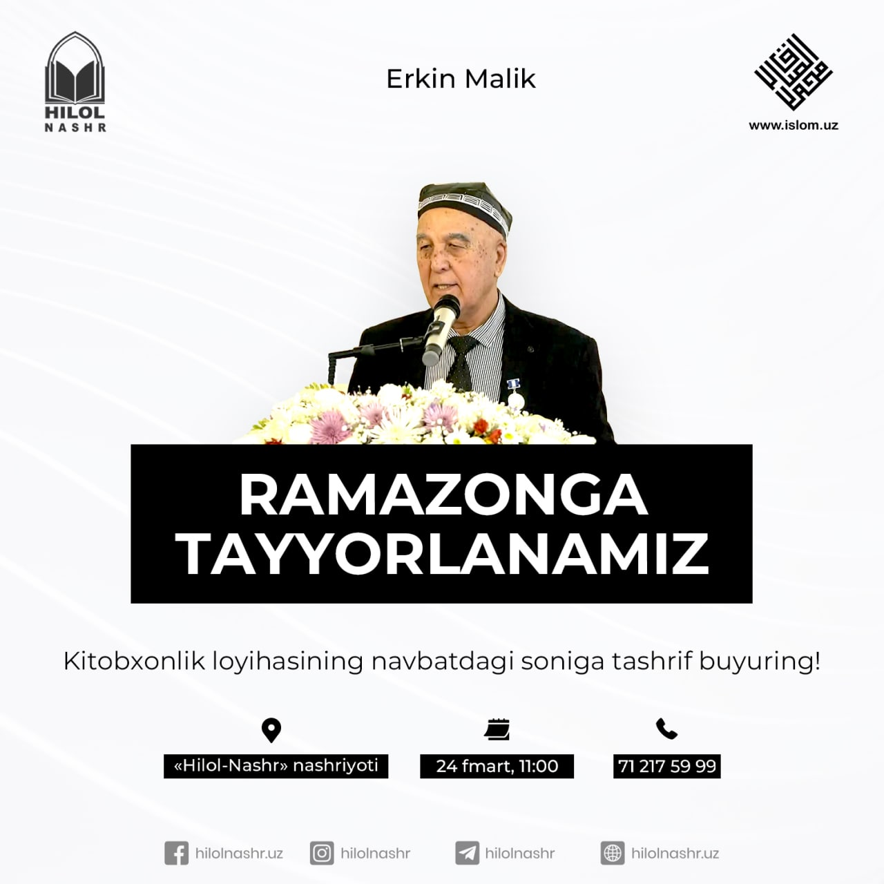 Бугун «Китобхонлик мактаби» лойиҳасининг навбатдаги сони ўтказилади. Лойиҳанинг бу галги сони муборак Рамазон ойига тайёргарлик мавзусида бўлади. Суҳбат давомида Рамазонга оид китоблар, Рамазон ойи давомида ўқиладиган, ўқилиши керак бўлган китоблар ҳақида маълумотлар, фикр-мулоҳазалар ўртага ташланади.