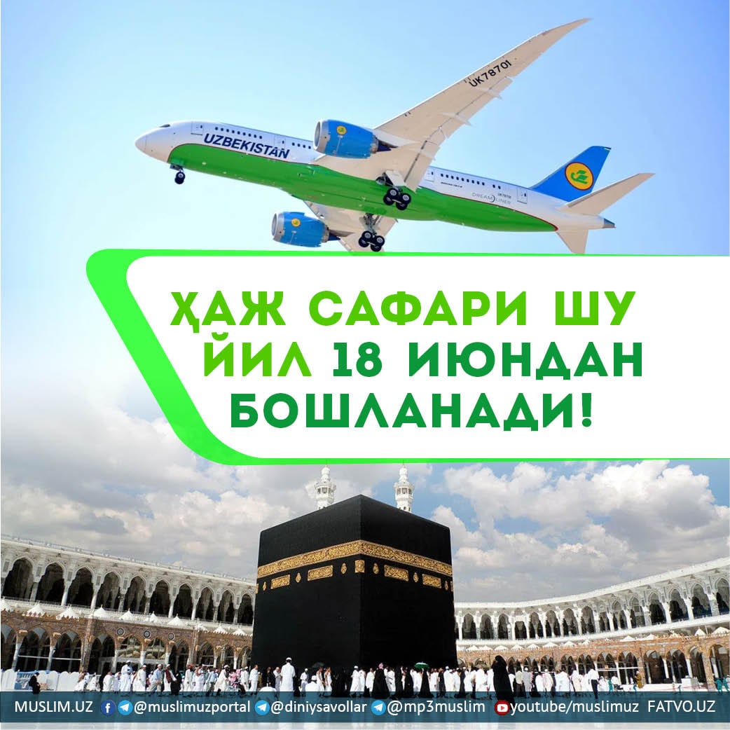 Ўзбекистон зиёратчилари шу йил 18 июнь куни «Uzbekistan Airways» авиакомпаниясининг сўнгги русумдаги замонавий ҳаволайнерлари орқали Саудия Арабистонига парвоз қилади. Муборак сафарга жўнаш авиақатновлари шу йил 30 июнга қадар давом этади.