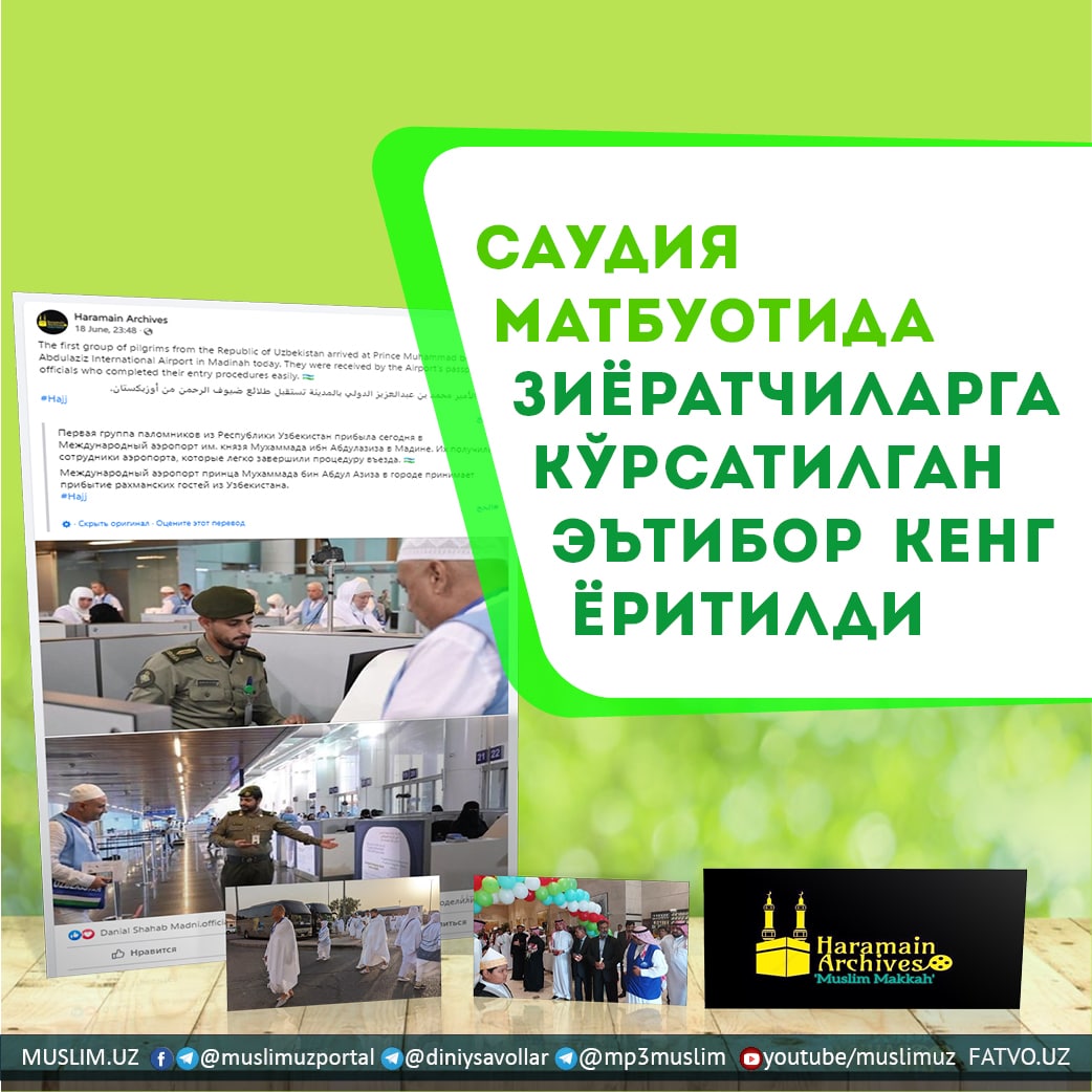 Саудия Арабистонининг етакчи нашрларидан бири "Haramain Archives" Мадина шаҳрига етиб борган ўзбекистонлик зиёратчилар ҳақида лавҳа намойиш этди. Унда ҳамюртларимизни саудиялик мутасаддилар томонидан муносиб кутиб олингани ҳақидаги тасвирлар ифода этилган.