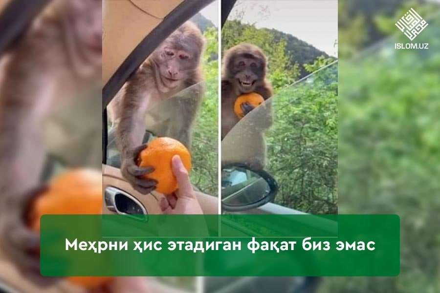 Расмга олган киши айтяпти: «Машина ойнасини бир маймун таққиллатди, оч қолгани сезилиб турарди, унга апельсин бердим, кетди. Бироз кузатиб турсам, бошқа маймуннинг олдига бориб, гўё менинг апельсин тарқатаётганим ҳақида хабар берди. Шериги ёнимга келди. Ажабланарлиси шундаки, апельсинни олгач, гўё ташаккур айтгандек менга шунақа табассум қилиб, жўнаб кетди. Шу ҳодисадан сўнг бу сайёрада меҳрни ҳис этадиган жонзот фақат биз эмаслигимизни, барча махлуқотлар ҳам биз каби ҳис этишини англадим».