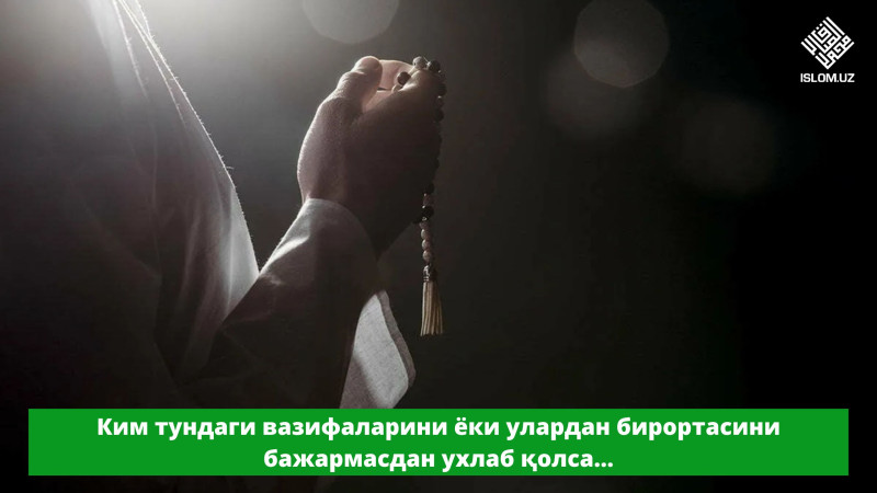 «Ким тундаги вазифаларини ёки улардан бирортасини бажармасдан ухлаб қолса, бас уларни бомдод намози билан пешин намози орасида ўқиб олса, гўё тунда ўқигандек бўлади», дедилар.