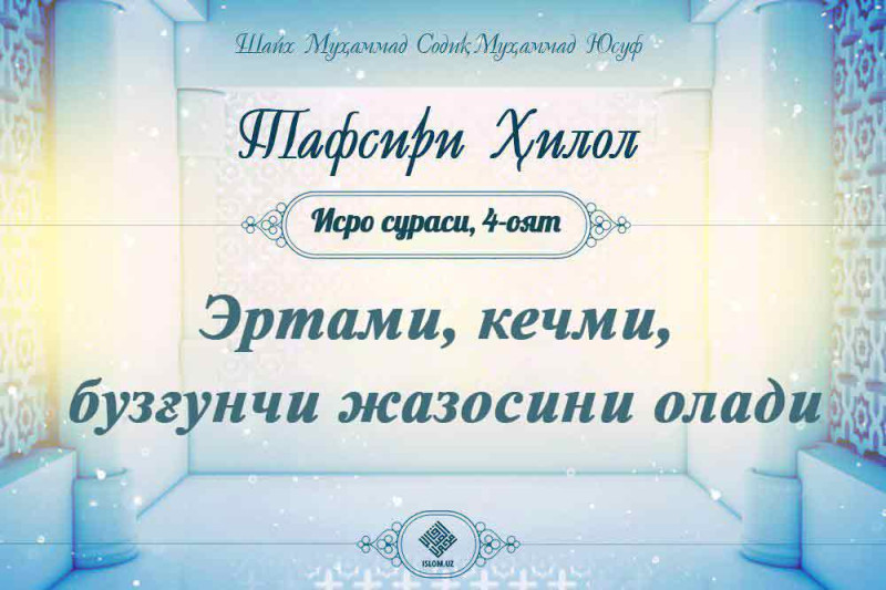 «Китобда Бану Исроилга: «Ер юзида икки марта бузғунчилик қилурсизлар ва катта даражада баланд кетурсизлар», – деб билдирдик» (Исро сураси, 4-оят).