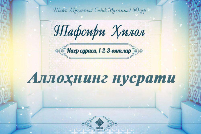 «Вақтики, Аллоҳнинг нусрати ва фатҳ келса... Ва одамларнинг Аллоҳнинг динига тўп-тўп бўлиб кираётганларини кўрсанг... Бас, Роббингни ҳамд ила поклаб ёд эт ва Ундан мағфират сўра. Албатта, У тавбани кўплаб қабул қилувчидир» (Наср сураси, 1-2-3-оятлар).