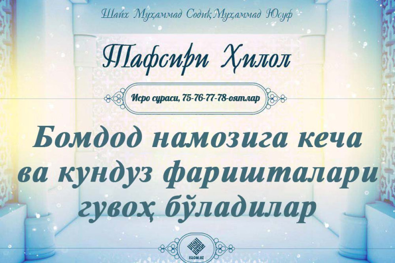 «Қуёш оғишидан то тун қоронғисигача намозни тўкис адо қил. «Фажр Қуръони»ни ҳам. Албатта, «фажр Қуръони» шоҳид бўлинадигандир» (Исро сураси, 78-оят).