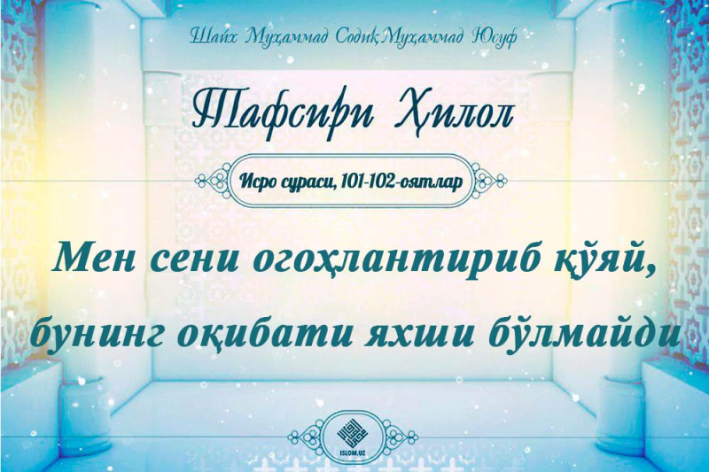 «Эй Фиръавн, сен анави тўққиз очиқ-ойдин мўъжизаларни ғафлат уйқусида қолганлар учун кўзларини очувчи қилиб, осмонлару ернинг Робби туширганини, Ундан ўзга ҳеч ким тушира олмаслигини яхши биласан. Лекин шундай бўлса ҳам, инкор қилмоқдасан. Иймонга келмай, куфрда қолмоқдасан. Аллоҳга банда бўлмай, Аллоҳнинг бандаларига худо бўлмоқчисан. Мен сени огоҳлантириб қўяй. Бунинг оқибати яхши бўлмайди. Билиб қўй, оқибатда ҳалок бўласан».
