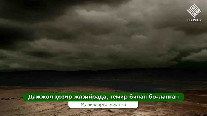 «Тамийм Дорий розияллоҳу анҳу менга шундай деди: «Фаластин аҳлидан баъзи одамлар кемага миниб, денгизга чиқишган экан. Денгиз уларни айлантириб, олиб бориб, денгиздаги ороллардан бирига отибди. Бирдан уларнинг олдидан нималигини билиб бўлмайдиган, жунлари ёйилган жонивор чиқиб қолибди. Улар унга «Сен нимасан?» дейишса, «Жассосаман», дебди. Улар: «Бизга хабар бер», дейишибди. «Мен сизларга хабар ҳам бермайман, сизлардан хабар ҳам сўрамайман. Лекин сизлар қишлоқнинг чеккасига боринглар. Ўша ерда сизга хабар берадиган, сиздан хабар сўрайдиган кимса бор», дебди. «Кейин биз қишлоқнинг четига бордик. Қарасак, занжир билан боғланган бир киши турибди. У: «Менга Зуғар булоғининг хабарини беринглар», деди. «У сувга тўла», дедик. «Менга кўлнинг хабарини беринглар», деди. «У ҳам сувга тўла», дедик. «Менга Урдун билан Фаластин орасидаги Байсон хурмозори хабарини беринглар. У мева бердими?» деди. «Ҳа», дедик. «Менга Набийнинг хабарини беринглар, у юборилдими?» деди. «Ҳа», дедик. «Менга одамлар унга нисбатан қандоқ эканликларининг хабарини беринглар», деди. «Улар у зотга ошиқмоқдалар», дедик. Шунда у шунақанги қаттиқ силкиндики, сал бўлмаса бўшалиб кетай деди. Шунда биз унга «Сен нимасан?» дедик. У ўзининг Дажжол эканлигини, Тийбадан бошқа барча шаҳарларга киришини айтди. Тийба – Мадинадир».