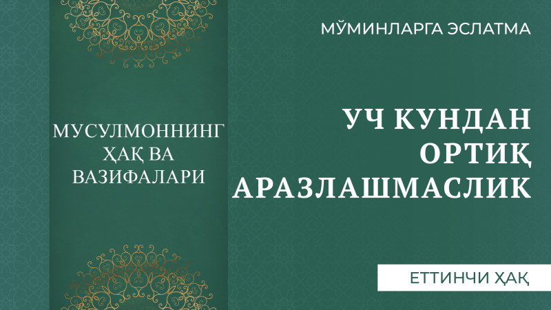 Исломда уч кундан кўп аразлашиб юрмаслик лозим. Зеро, Расулуллоҳ соллаллоҳу алайҳи васаллам: “(Мусулмон) киши учун уч кундан кўпга (дин) биродарини (аразлашиб) тарк этиши ҳалол бўлмайди. Улар учрашадилар-у, бир-бирларидан юз ўгирадилар. Уларнинг яхшироғи саломни биринчи бўлиб берадиганидир”, деганлар.