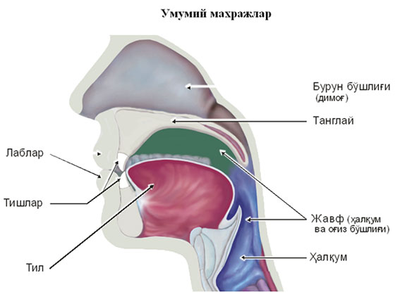 Қуйида мазкур нутқ аъзолари учун умумий сурат берилган. Унда ҳар бир аъзо ўзига хос рангга эга. Аъзо, бошқача қилиб айтганда, ҳар бир умумий махраж номи унинг ёнига ёзилган. Сиз уларни яхшилаб англаб, ёдда сақлаб қолинг.