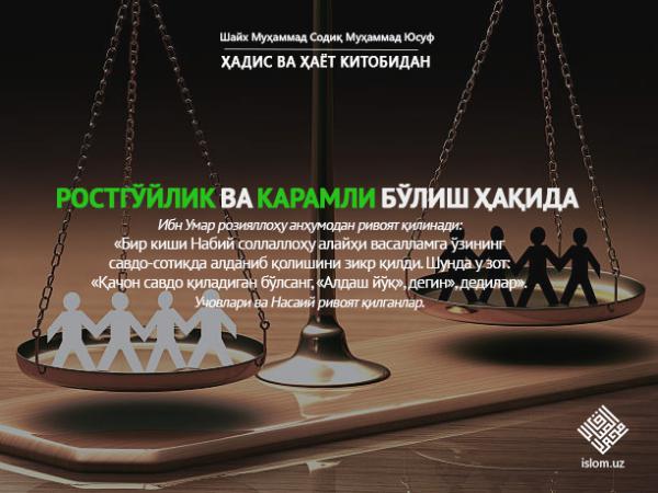 Шунинг учун савдогар ростгўй бўлиши керак, қасам ичиб, молини ўтказишга уринмаслиги лозим. Ростгўйлик билан, бировни алдамасдан қилинган савдода барака бўлади. Эгасига юқади, фойда беради.
