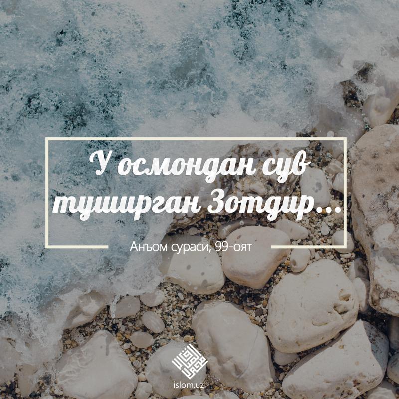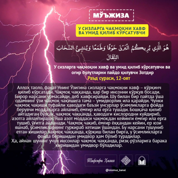 У сизларга чақмоқни хавф ва умид қилиб кўрсатувчи ва оғир булутларни пайдо қилувчи Зотдир. Раъд сураси, 12оятАллоҳ таоло, фақат Унинг Ўзигина сизларга чақмоқни давоми...