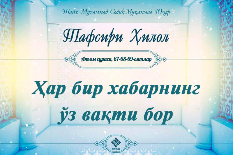 Қавминг уни ёлғонга чиқарди. Ҳолбуки, у ҳақдир. Сен .Мен устингизда вакил эмасман, Анъом сураси 66оят. .Ҳар бир хабарнинг ўз вақти бор. Тезда буни давоми...