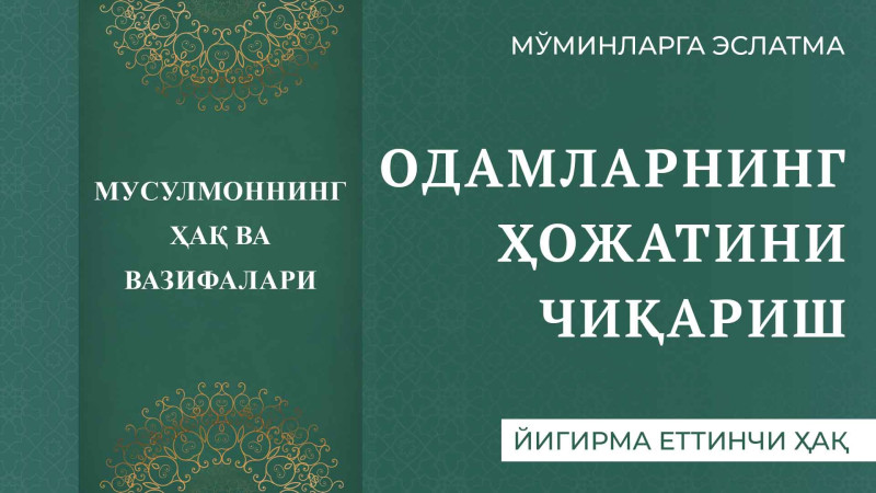Одамларнинг ҳожатини чиқариш.Ҳожатбарорлик чин мусулмоннинг олий инсоний фазилатларидан биридир. Ким бўлишидан қатъи назар, имкон қадар жонкуяр бўлиш катта давоми...