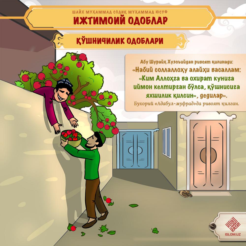 Исломда ижтимоий алоқалар ҳақида сўз кетганда, қўшничилик алоқаларига катта аҳамият берилади. Ушбу алоқаларни гўзал тарзда олиб бориш ҳақидаги таълимотлар давоми...