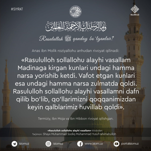 .Расулуллоҳ соллаллоҳу алайҳи васаллам .Бу кеча менинг ўғлим туғилди. Уни бобом Иброҳимнинг исми билан давоми...