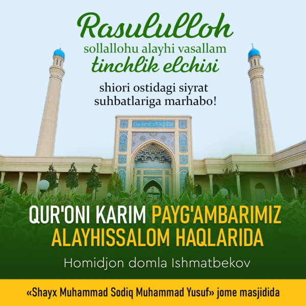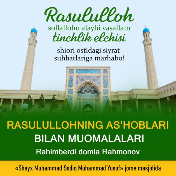 Бугун, 9 октябрь душанба куни шом намозидан сўнг .Шайх Муҳаммад Содиқ Муҳаммад Юсуф, жомеъ масжидида .Расулуллоҳ mdash тинчлик элчиси, шиори остида ўтказилаётган давоми...