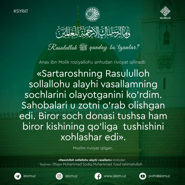 Анас ибн Молик розияллоҳу анҳудан ривоят қилинади.Сартарошнинг Расулуллоҳ соллаллоҳу алайҳи васалламнинг сочларини олаётганини кўрдим. Саҳобалари у зотни ўраб давоми...