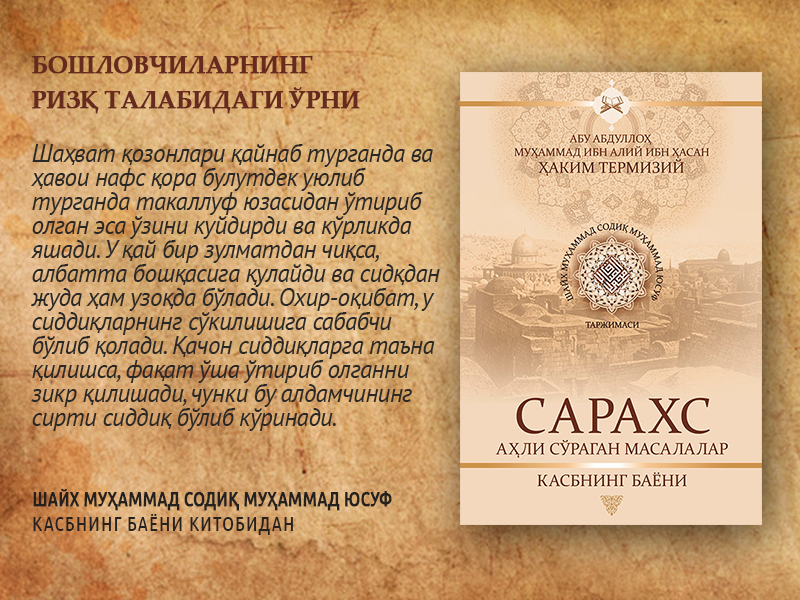 Шаҳват қозонлари қайнаб турганда ва ҳавои нафс қора булутдек уюлиб турганда такаллуф юзасидан ўтириб олган эса ўзини куйдирди ва кўрликда яшади. У қай бир давоми...