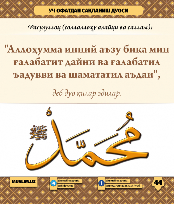Расулуллоҳ соллаллоҳу алайҳи ва салламquotАллоҳумма инний аъзу бика мин ғалабатит дайни ва ғалабатил ъадувви ва шамататил аъдаиquot. Маъноси Ё Аллоҳ Қарзга ботиб, давоми...