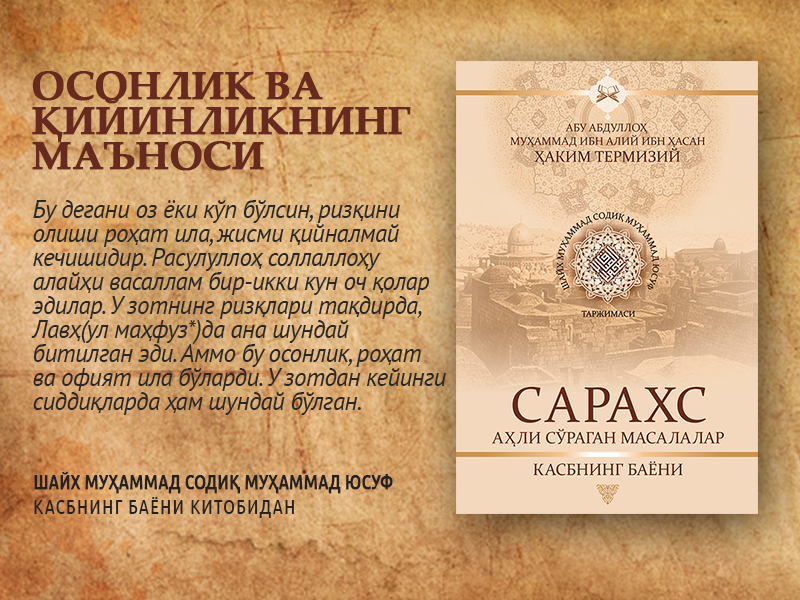 Бу дегани оз ёки кўп бўлсин, ризқини олиши роҳат ила, жисми қийналмай кечишидир. Расулуллоҳ соллаллоҳу алайҳи васаллам бирикки кун оч қолар эдилар. У зотнинг давоми...