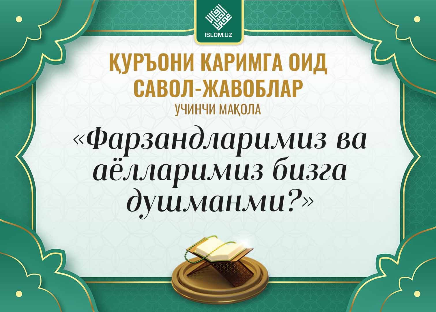 3савол .Фарзандларимиз ва аёлларимиз бизга душманми,Бисмиллаҳир роҳманир роҳим. Алҳамдулиллаҳ васоллаллоҳу васаллама ва барока аъла Расулиллаҳ ва ала алиҳи ва давоми...