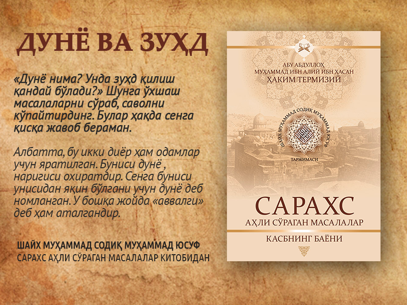 .Дунё нима Унда зуҳд қилиш қандай бўлади, Шунга ўхшаш масалаларни сўраб, саволни кўпайтирдинг. Булар ҳақда сенга қисқа жавоб бераман.Албатта, бу икки диёр ҳам давоми...