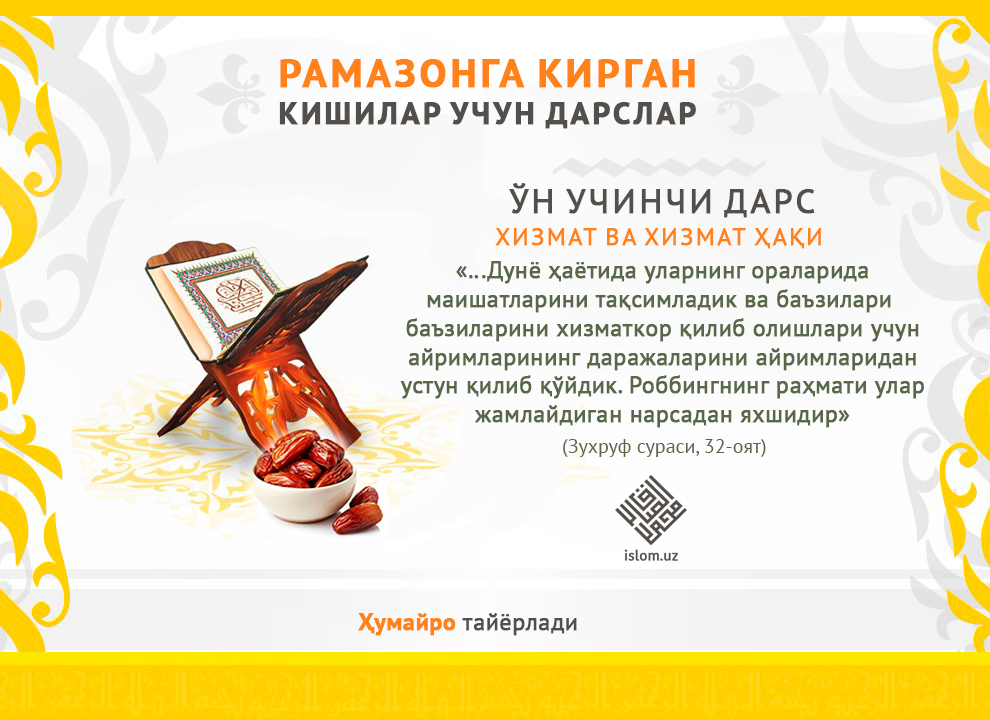Хизмат ва хизмат ҳақиАллоҳ таолобандаларига Ўз илми билан ризқни тақсим қилган. Ўзи хоҳлаганига Ўз ҳикмати билан бериб, Ўзи хоҳлаганидан адли билан ман қилган. давоми...