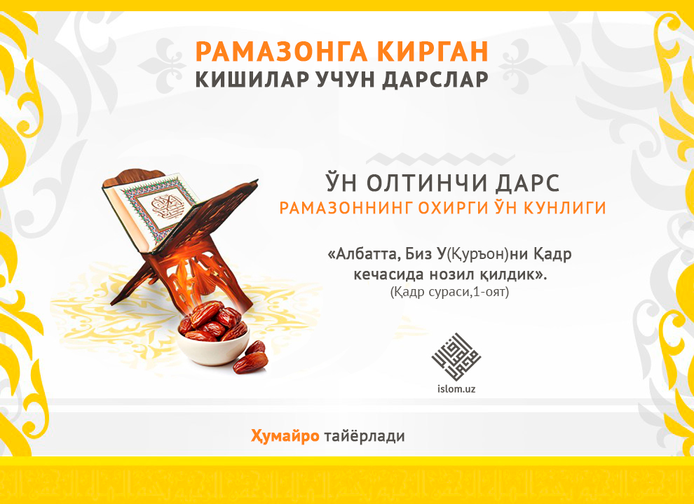 Рамазоннинг охирги ўн кунлиги.Қадр кечаси.Улуғ кунлар ниҳоялаб оз фурсат қолди. Бу Рамазоннинг охирги ўн кунлигидир. Бу улуғ ойнинг бошланиши ва ниҳояси давоми...